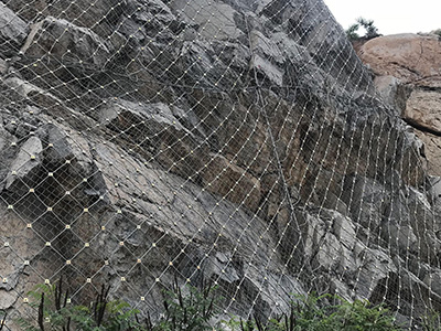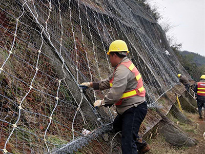 作用原理上類似于噴錨和土釘墻等面層護坡體系,但因其柔性特征能使系統將局部集中荷載向四周均材質:鋼絲繩網、普通鋼絲格柵(常稱鐵絲格柵)和TECCO高強度鋼絲格柵勻傳遞以充分發揮整個系統的防護能力,即局部受載,整體作用,從而使系統能承受較大的荷載并降低單根錨桿的錨固力要求。